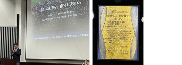 本校がSTEAM・探究グランプリにおいてグランプリを頂き、報告会と表彰式に参加してきました。報告会は生徒と職員が、現地と秋田をオンラインで繋ぎながら実施し、取組内容を紹介することができました。表彰式では、PLIJの理事長である浦嶋様より楯をいただきました。