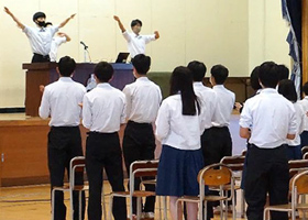 当日、県⼤会出場のため不在だった吹奏楽部にかわり、軽音楽同好会の歓迎演奏から始まったオリエンテーションでは、⽣徒会代表あいさつ、⽣徒会執⾏部による学校説明プレゼンテーション、吹奏楽部演奏や書道パフォーマンスなど新⾼祭での映像、新制服候補のお披露目など、中学⽣が新屋⾼校での⾼校⽣活を予⾒できるようなコンテンツを発表し、好評を得ることができました。