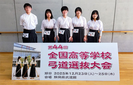 12月23日(火)~25日(木)に静岡県藤枝市の静岡県武道館において、今年度の全国選抜大会が開催されました。本校弓道部は、男子個人の部に槇木知優選手(2年)および女子団体の部(後藤世奈(2年)・中田佳里(2年)・藤島惟衣(2年)・川村優亜(2年))に出場してきました。女子団体は4年ぶり8回目の全国選抜出場です。